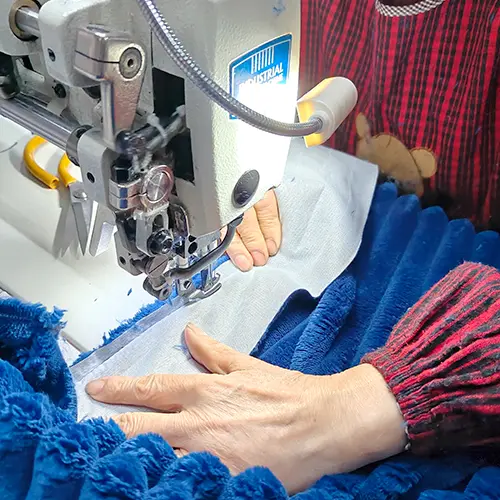 We finalize the sewing specifications and processing flow, manage material input schedules, and direct both the sewing and processing teams. Every step of production is carefully monitored.